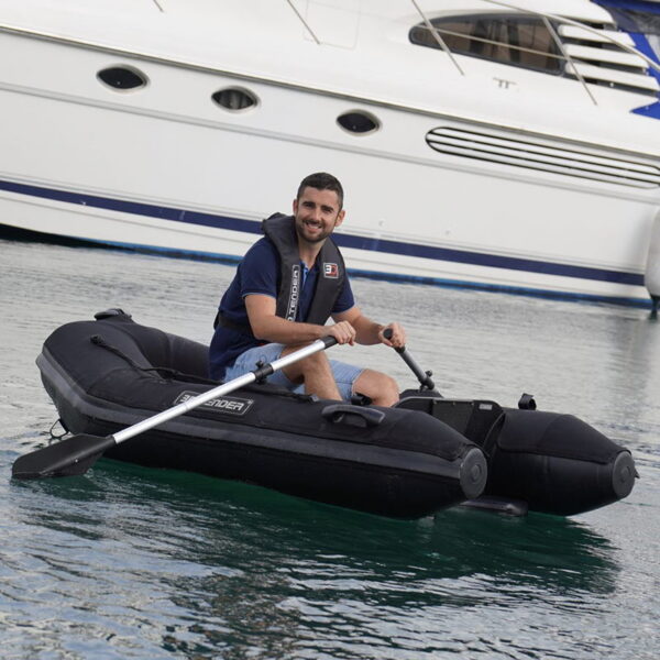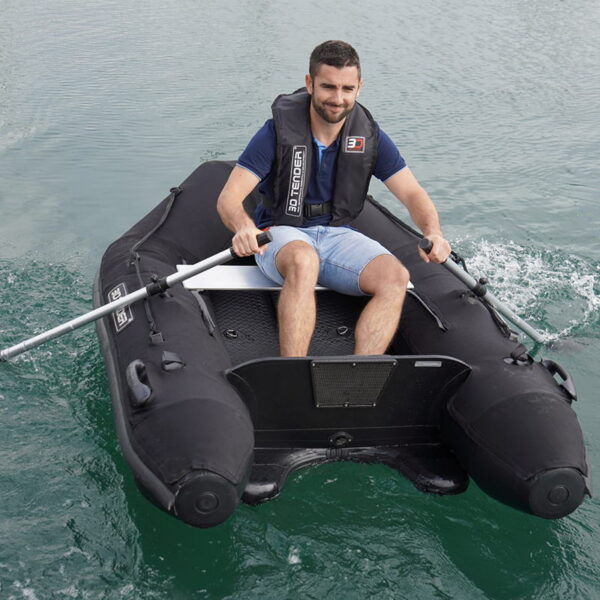 Like all folding dinghies in the 3D Tender range, the VIB Air is equipped with an adjustable aluminium bench, a pair of oars, an inflator and a carry bag.