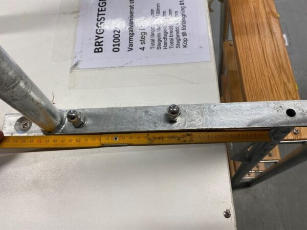 Hot galvanized steel, wooden steps. For use in fresh water. If you have a ladder in the water all year round, you should treat the wood to protect it from the elements. – Overall length: 1880mm – Ladder length: 1100mm – Handles: 690 mm – Overall width: 530 mm – Step width: 450 mm.