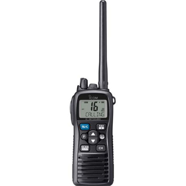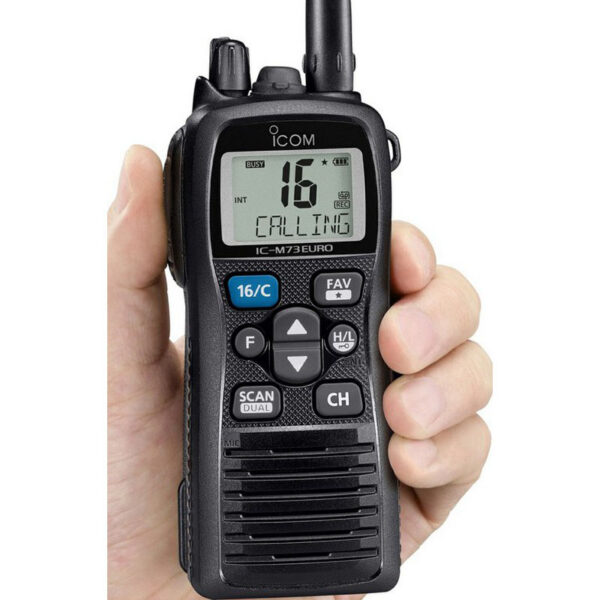 The IC-M73EURO is a powerful handheld marine VHF radio that features IPX8 submersion rating, 6 watts high output, long battery life and a compact ergonomic body amongst many other features