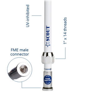 The antenna is supplied with 6m (20′) high performance RG-8X cable with 97% copper braid coverage, that guarantees a perfect shielding from external interferences. Stainless steel ferrule with standard 1″ x 14 threads to fit on every type of mount (stainless steel/chrome brass mounts are suggested).