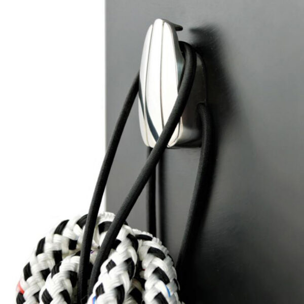 Stainless steel A4 (AISI 316) hook with 30 cm rope loop, designed for tidy storage of ropes, cables, fenders, hats, or towels. The spring-loaded hook secures items firmly, while the concealed fasteners give a clean look. Easy one-hand operation. Size: 53 × 32 mm.