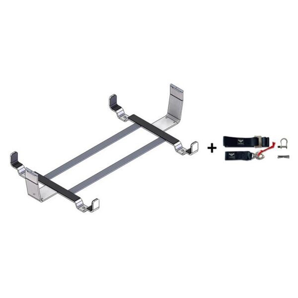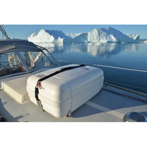 A stainless steel cradle for VIKING RescYou™ Ocean and RescYou™ Coastal liferafts. To ensure quick access the container is mounted on the cradle by a single strap with a quick release buckle. Predrilled holes have a diameter of Ø11.