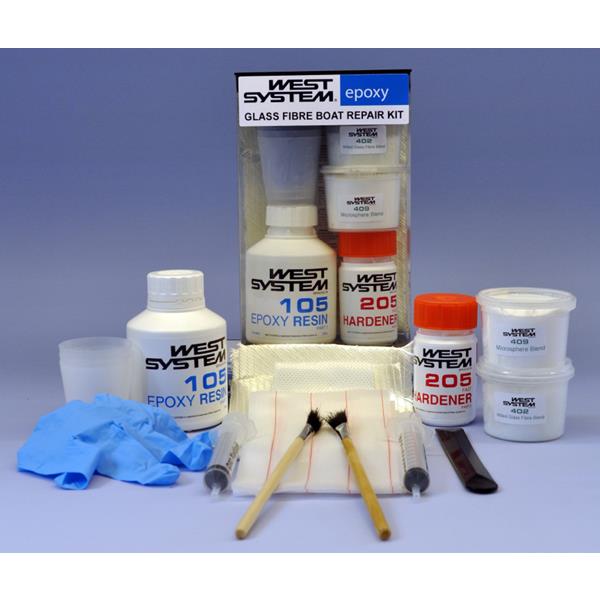Repair cracks and scrapes, gelcoat blisters, loose hardware, delaminated decks and panels, damaged keels and holes up to 1″ diameter in solid laminates up to ¼” thick, and smaller holes in thicker laminates. Each Fiberglass Boat Repair Kit contains eight packets of WEST SYSTEM® 105 Epoxy Resin® and 205 Fast Hardener®, fiberglass fabric, adhesive filler, fairing filler, glue brushes, mixing cups, a reusable mixing stick, an application syringe, three pairs of protective gloves, and illustrated instructions for completing a variety of common fiberglass repairs.